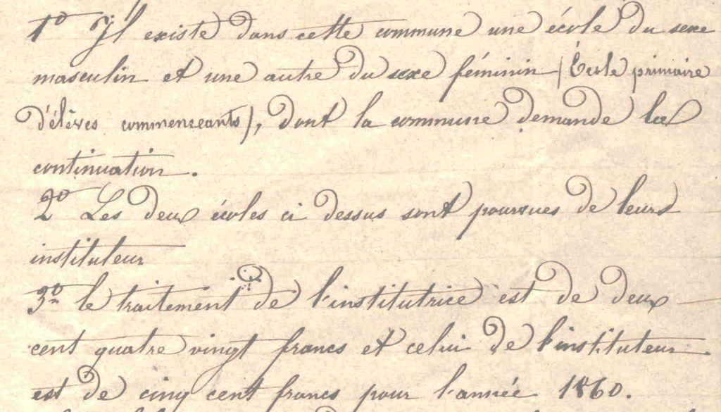 Lettre du 15 octobre 1860, du maire à l’inspecteur. Remarquer les salaires de 280 Fr pour l’institutrice et de 500 Fr pour l’instituteur !