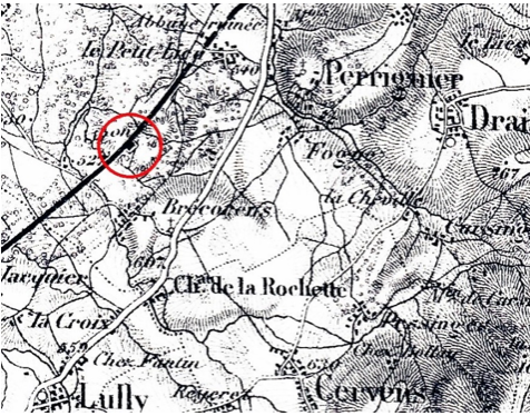 Carte de l’époque de l’ouverture de la ligne : la nouvelle gare est dans le cercle rouge. Aucune route n’y aboutit. Seule la route nationale (future D903) traverse le secteur. Les villages ne sont desservis que par des chemins.