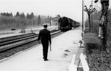 La gare de Perrignier en 1960. Le chef de gare, dans sa tenue réglementaire, n’existe plus, la halle à marchandises a disparu au profit d’un parking.