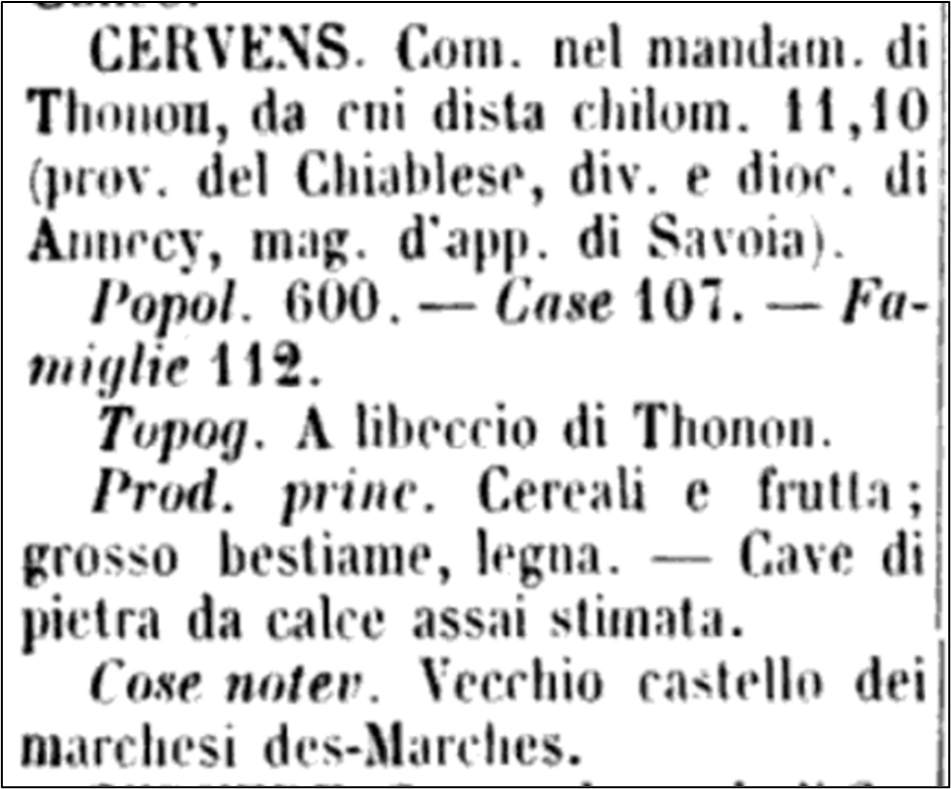 La fiche ci-dessous est extraite du Dictionnaire statistique des États sardes pour l’année 1855, publication officielle du gouvernement de Turin.