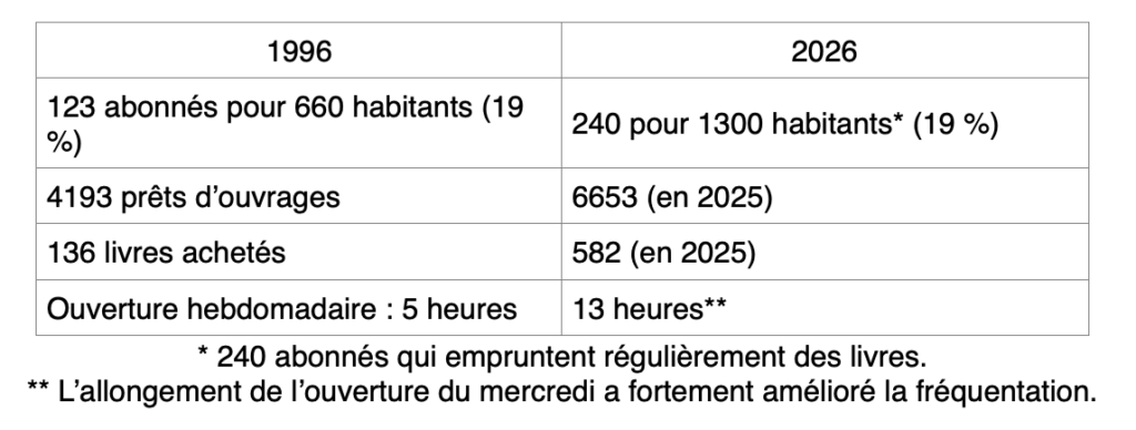2026 : La bibliothèque poursuit la politique culturelle mise en place depuis de nombreuses années. Elle accueille les enfants de l’école (accueil facilité par l’accès direct depuis les salles de classe) et leurs enseignants ; elle organise de nombreuses animations (2 à 4 par mois) en direction des jeunes et des adultes : atelier création florale, atelier Légo pour les enfants, apéro-dictée, café-lecture (le dernier samedi du mois). La moyenne mensuelle de fréquentation en 2025 s’établit à 250 visites.