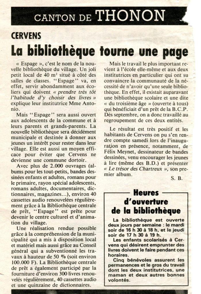 1999 : la bibliothèque devient municipale, intégrée dans un réseau de quatre bibliothèques du Syndicat intercommunal de la Côte et du Redon (Armoy, Cervens, Orcier, Perrignier), suivant en cela une démarche intercommunale de mutualisation des moyens. A partir de cette date, le Foyer rural n’est plus impliqué directement.