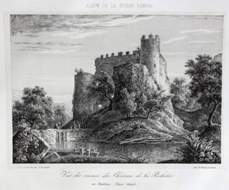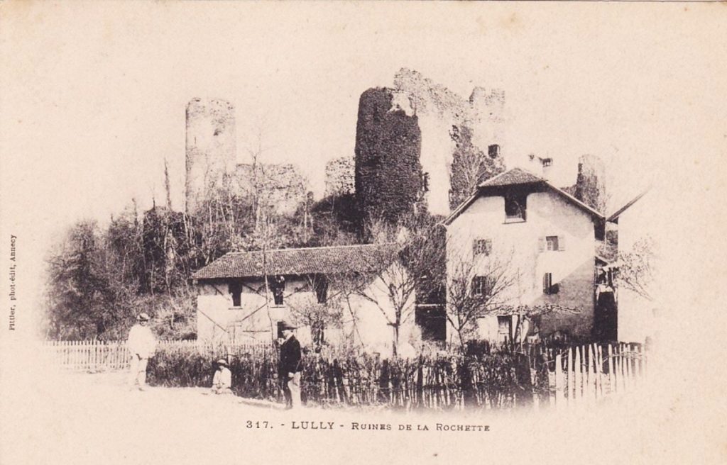 Les ruines du château vues vers 1900 depuis la route de Lully à Perrignier