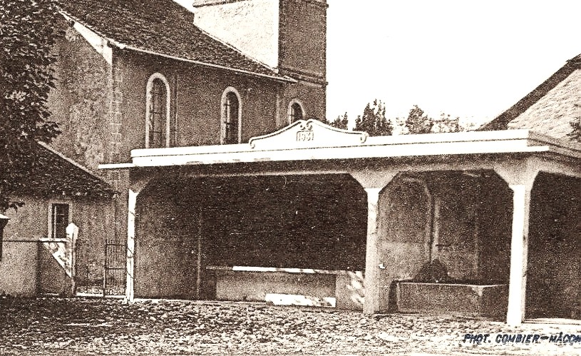 Le bassin-lavoir du chef-lieu : construit en 1931, il est démoli en 1971, en même temps que l’ancien presbytère. À gauche le lavoir, à droite le premier bassin de 1859.